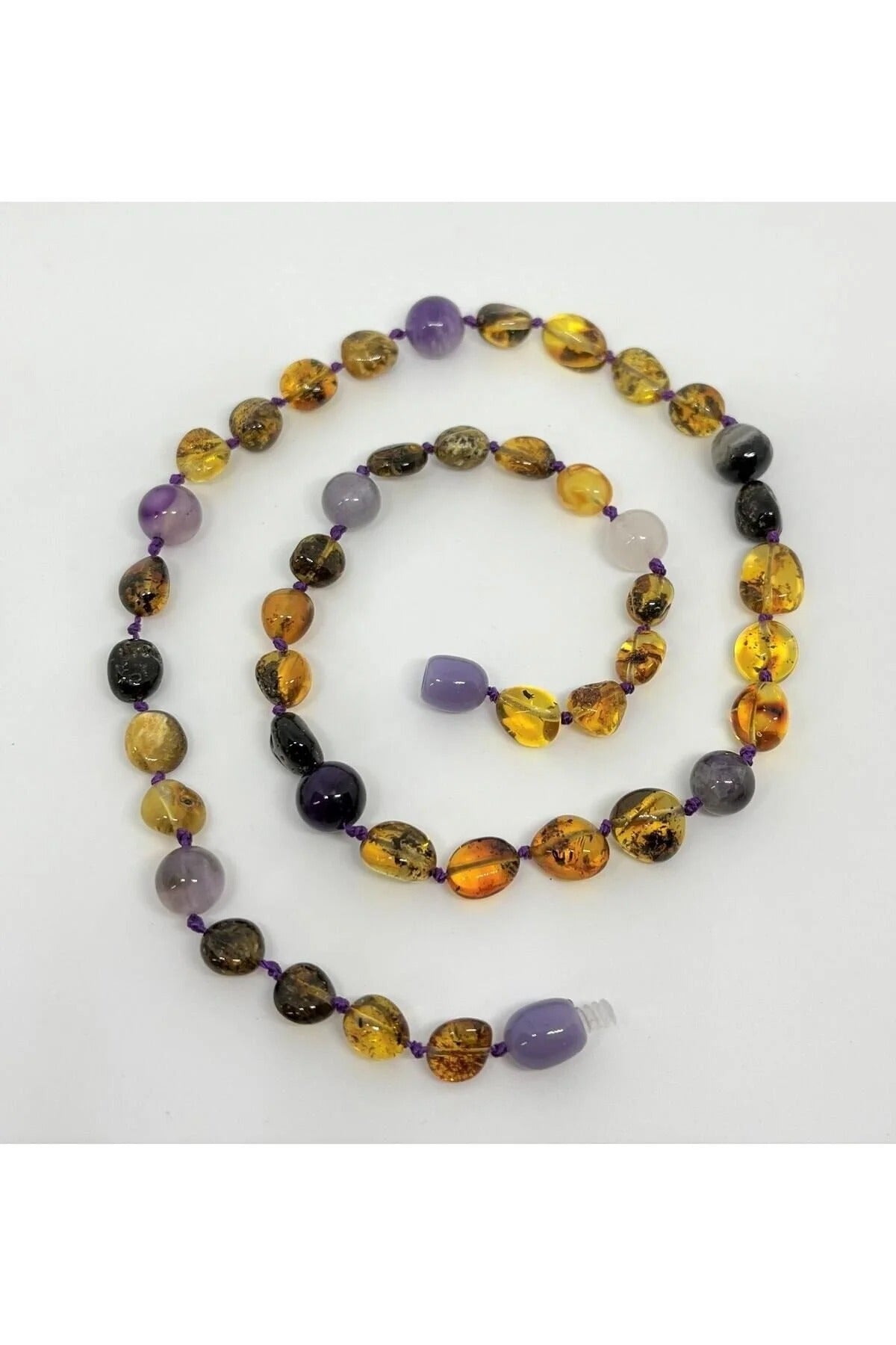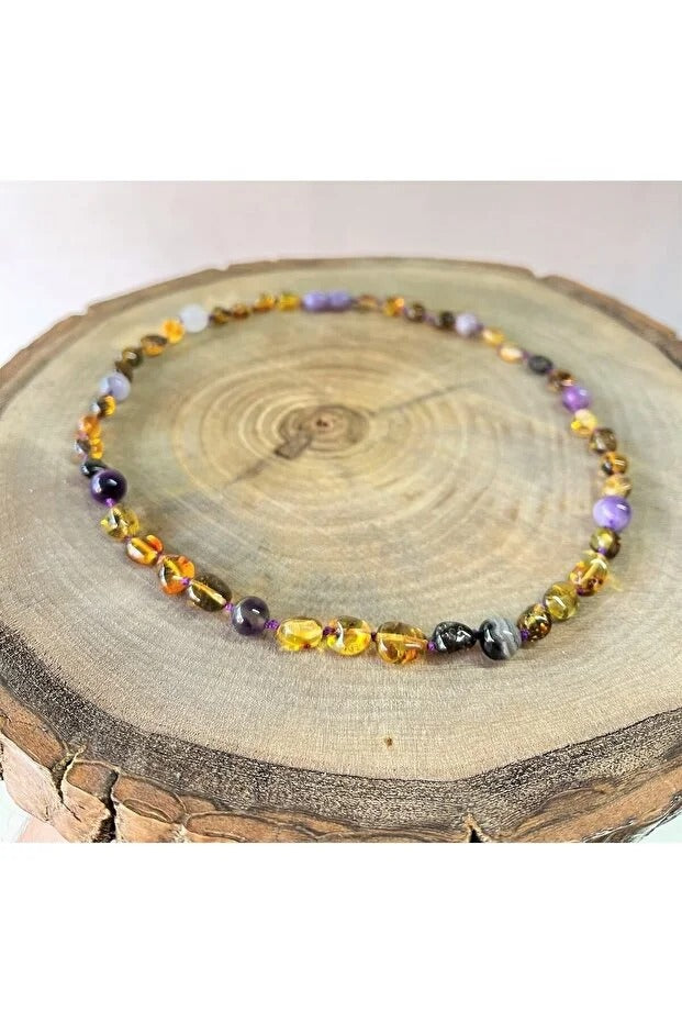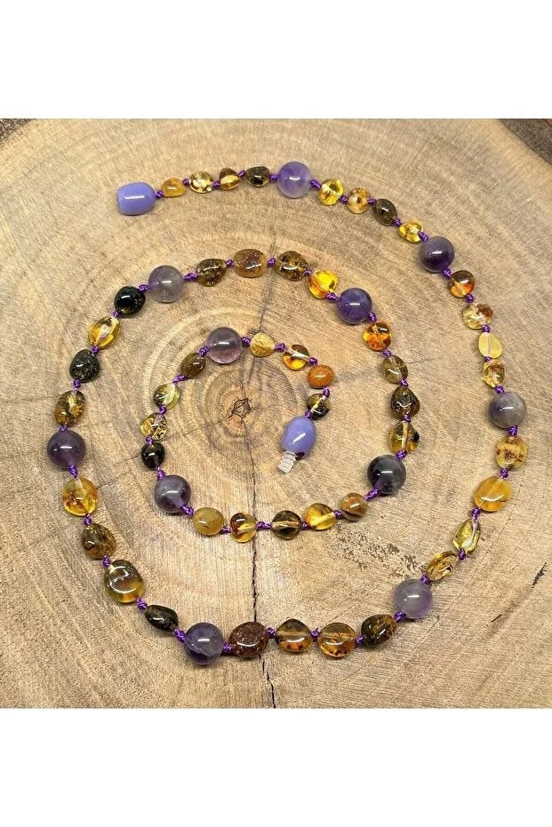 Damla Kehribar Çocuk Genç Ametist Tasarım Kolye 40cm